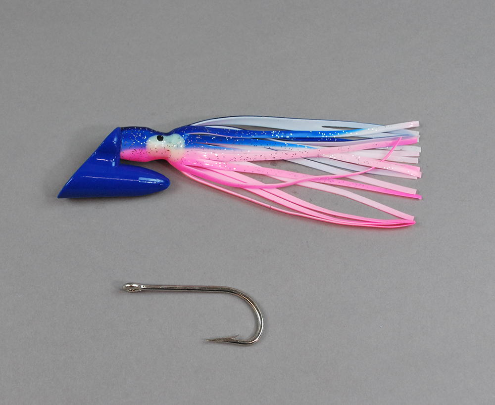 The Pirate Plug is a unique trolling lure that can turn a bad day of fishing into a great day.  The Pirate Plug can be trolled with a ballyhoo or a cigar minnow.  The weighted sloped head keeps the bait running straight and always diving down.  This lure can make an amateur bait rigger look like a pro.  When used with our rigging style your bait will not spin and it will track straight with a vigorous swimming action.